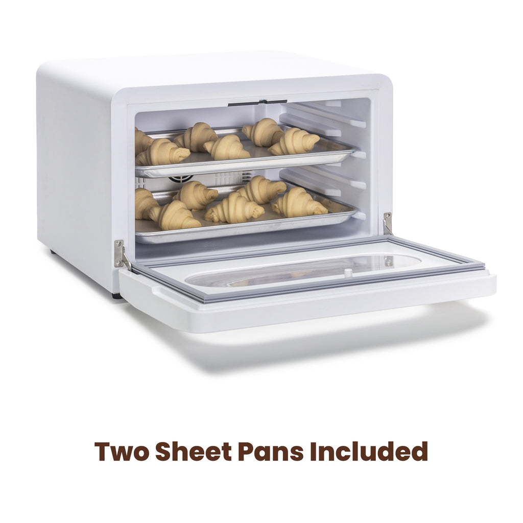 Four half sheet pans or six bannetons — about the footprint of a large microwave. Two half sheet pans included. Full batch proofing, multiple doughs, no scaling down.